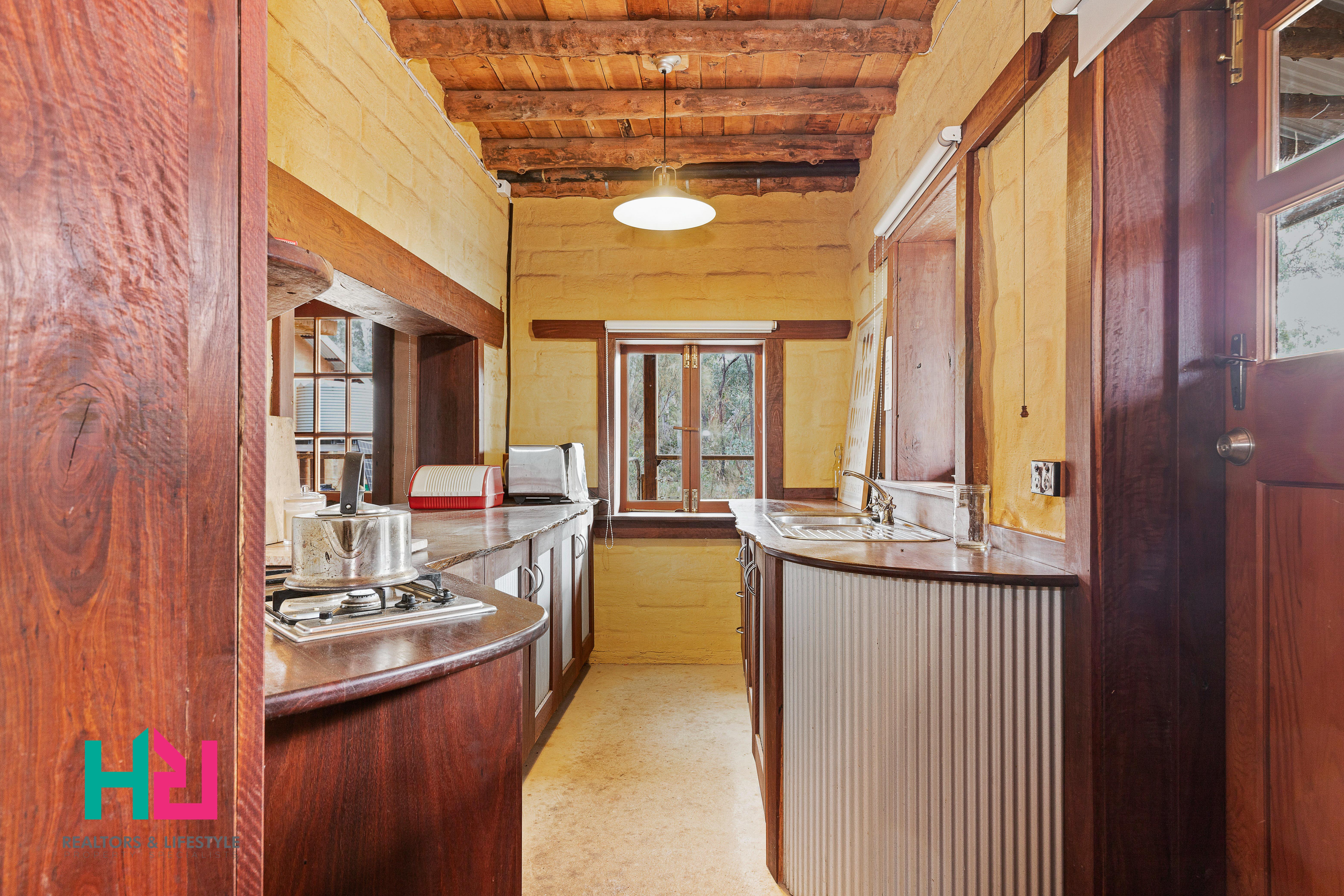 - Hand-crafted timber kitchen with vermin-proof hand-crafted hardwood cupboards. Gas cooktop and a Nectre slow combustion wood heater/stove