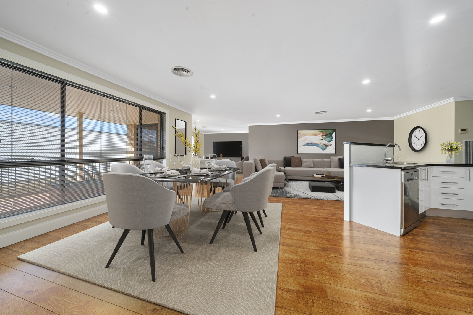 - Spacious open plan living & dining room with glass sliding doors, opening out to a covered veranda, perfect for entertaining
