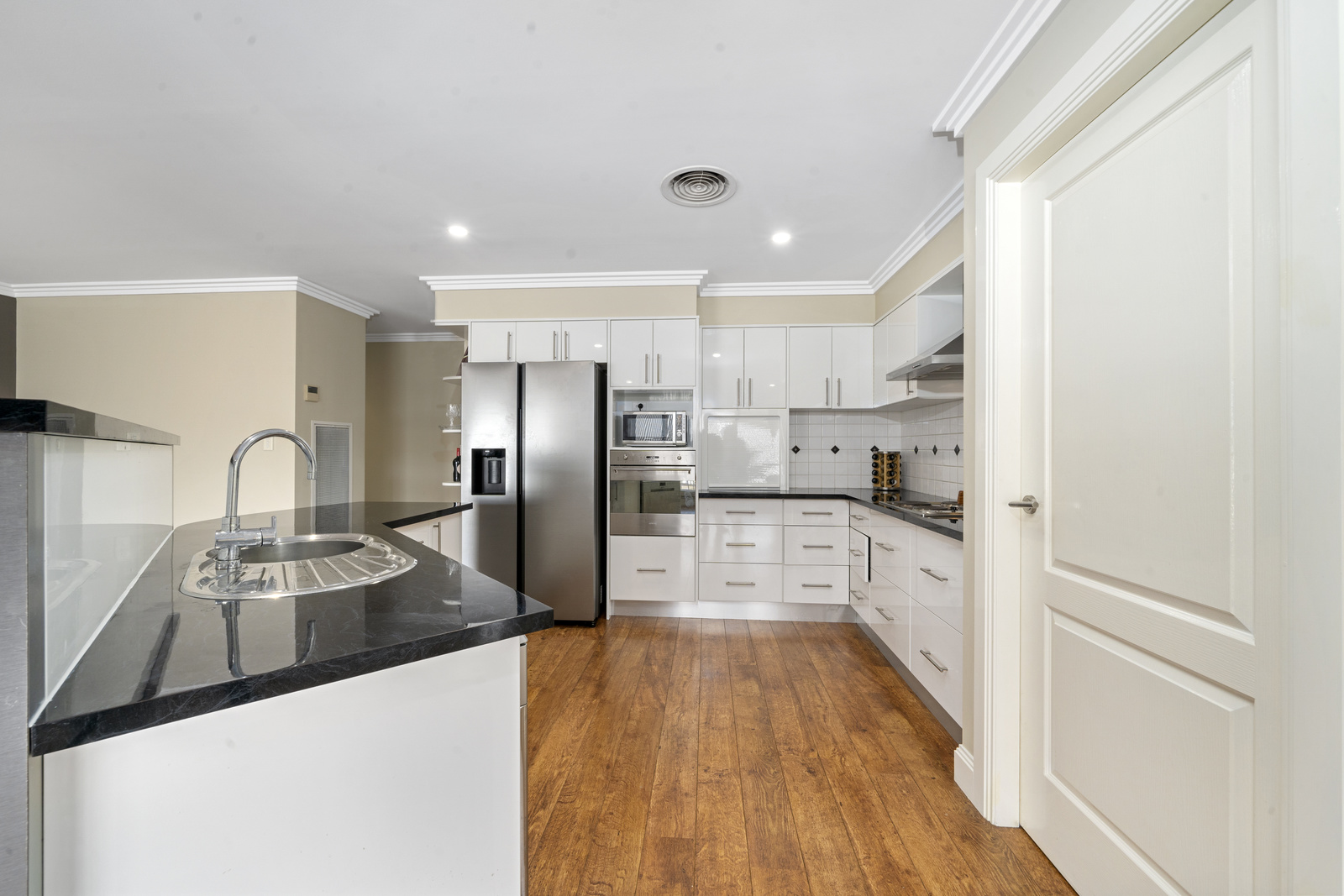 - Contemporary kitchen with plentiful white cabinetry, stainless appliances, electric cook top, sleek black stone bench-tops and an oversized walk-in pantry.