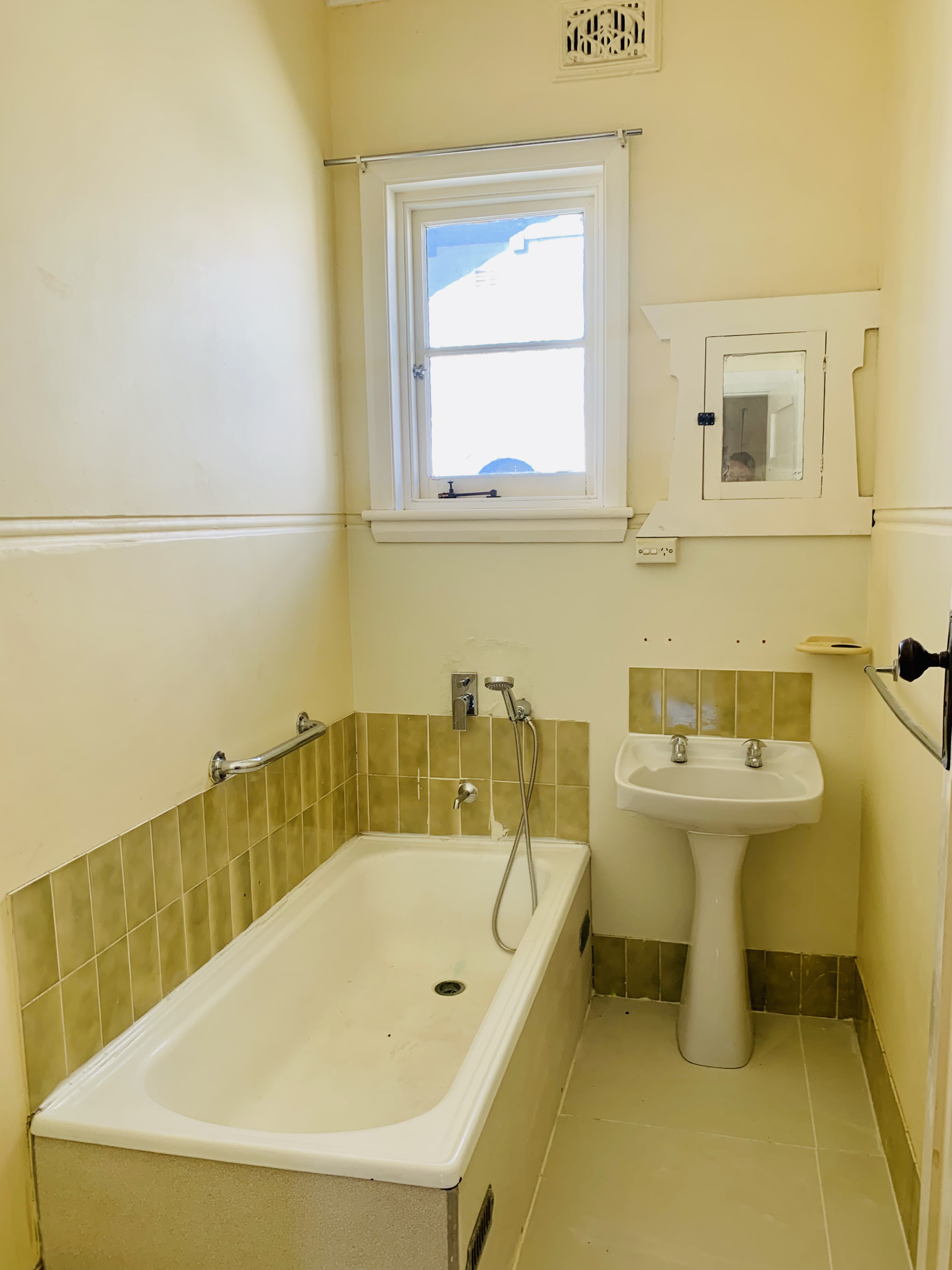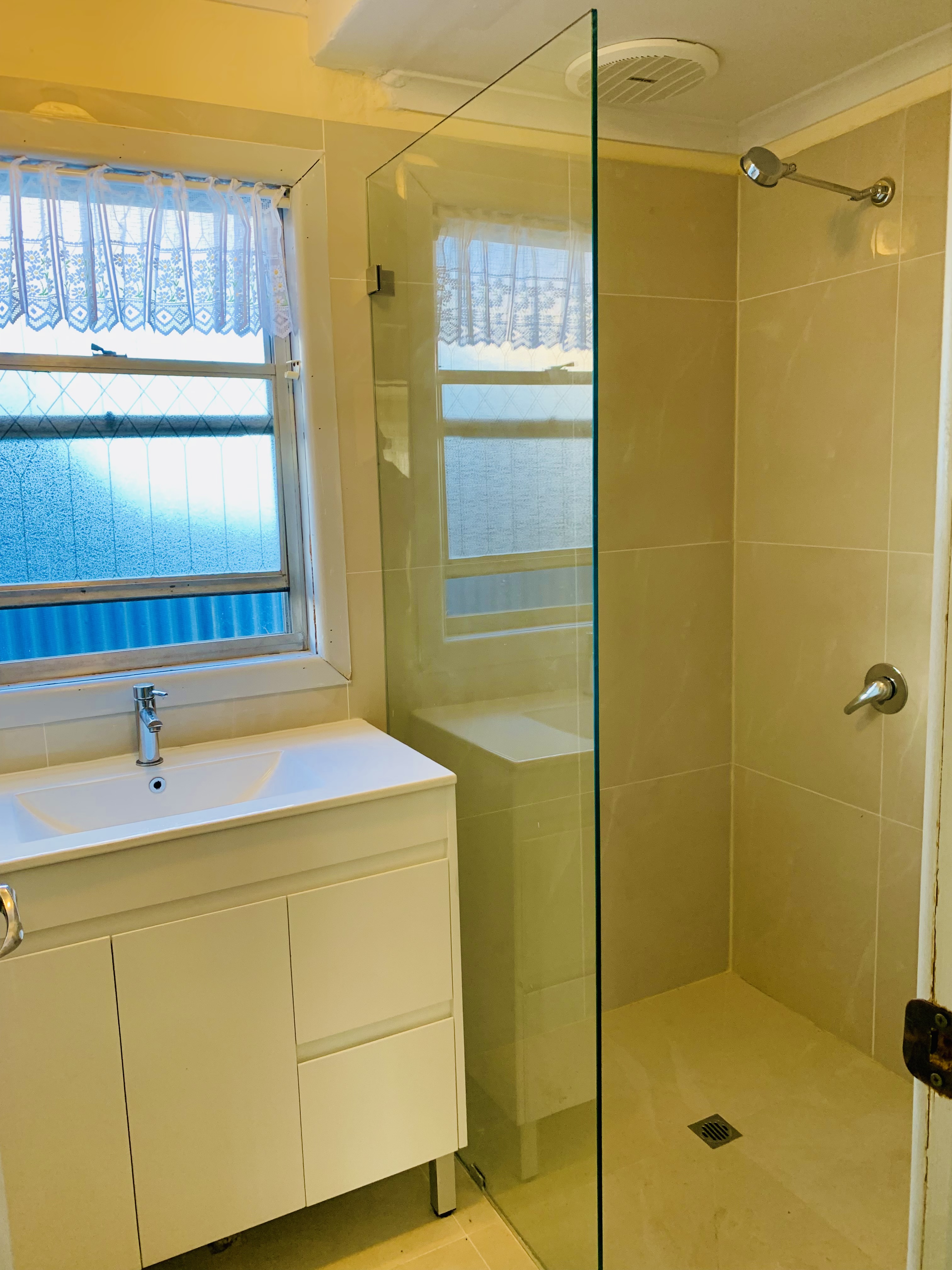 There are two bathrooms one with a bath and the other recently renovated with a shower