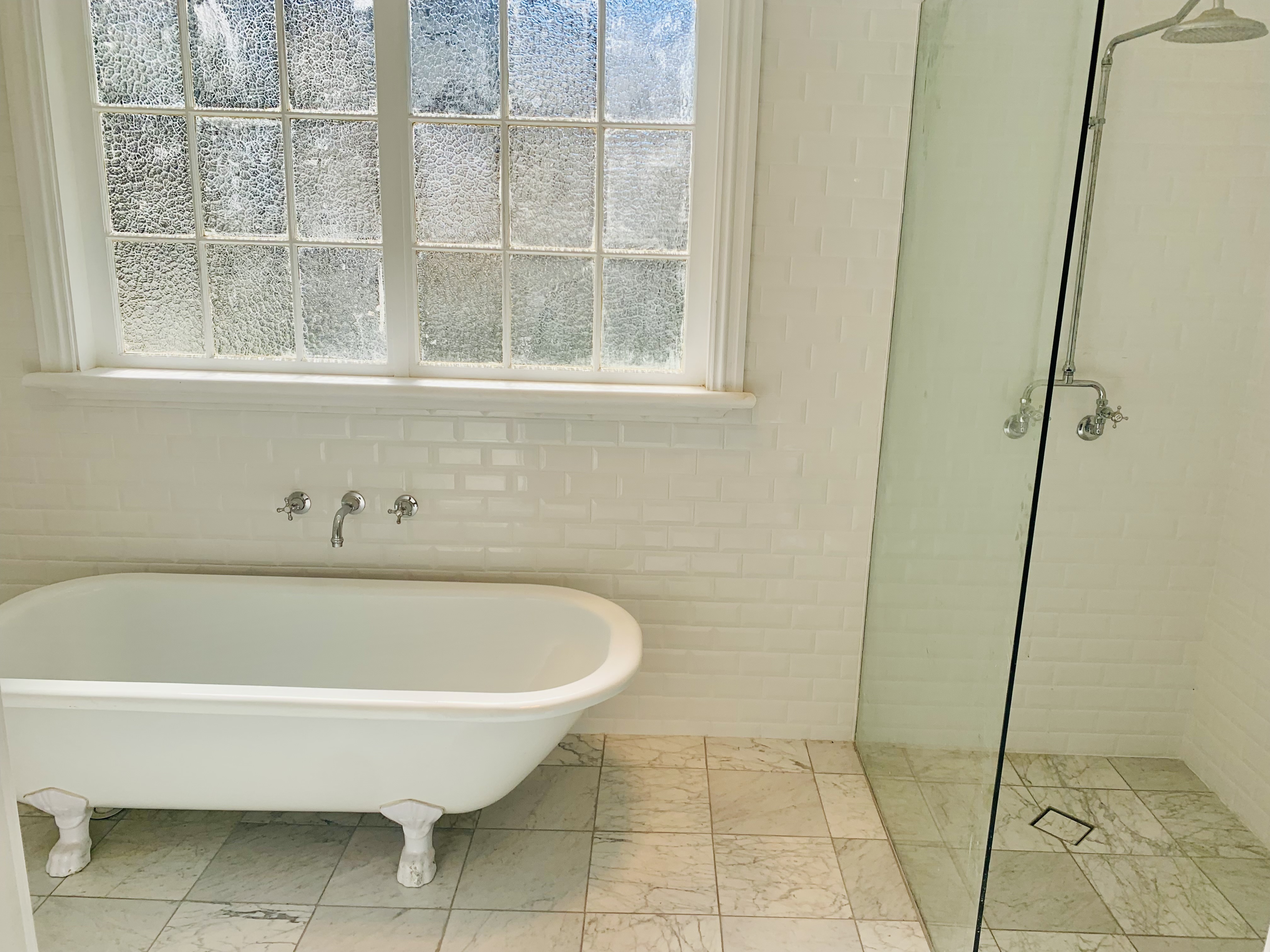 Spacious bathroom with free-standing bath with separate shower and toilet