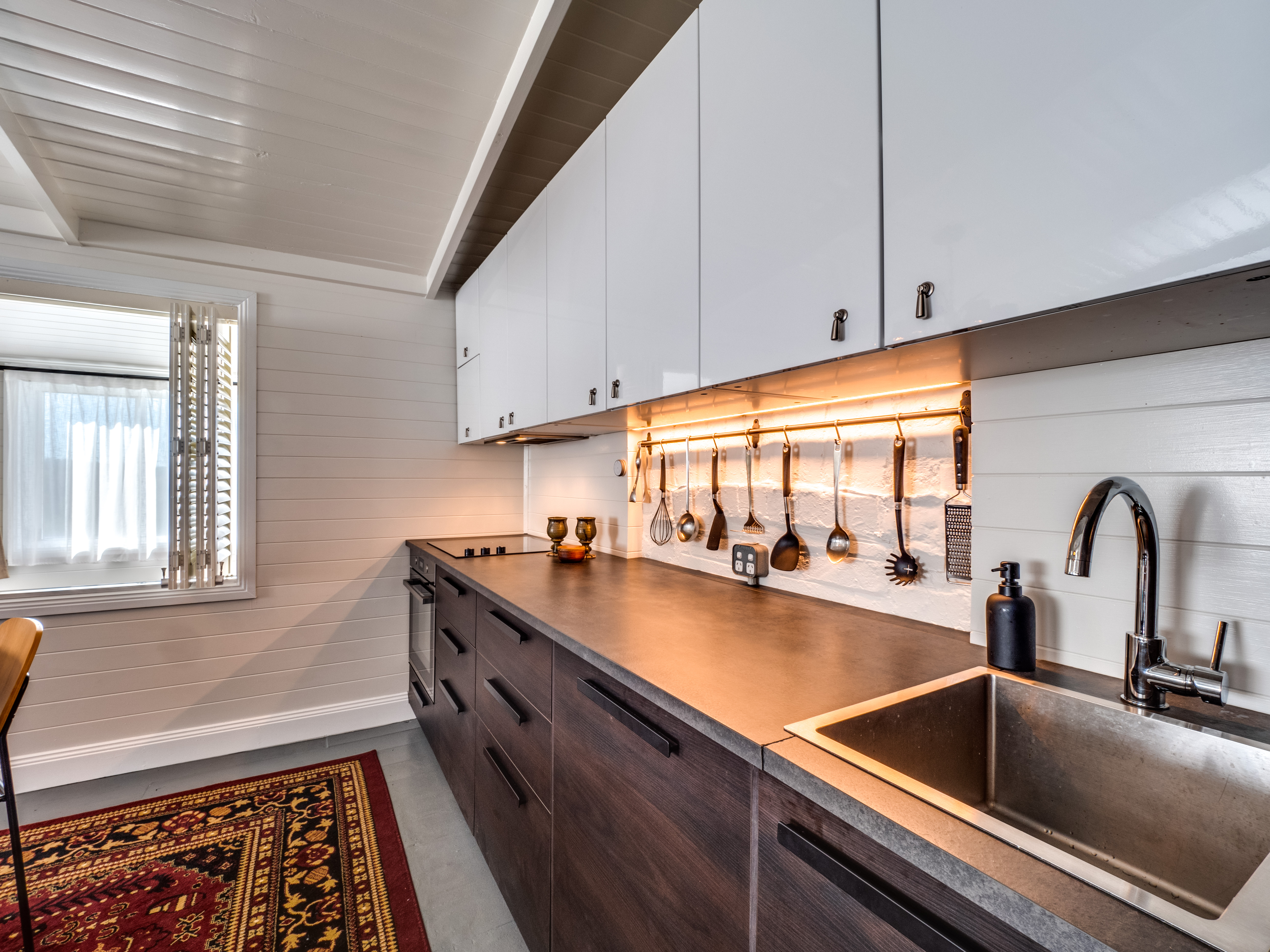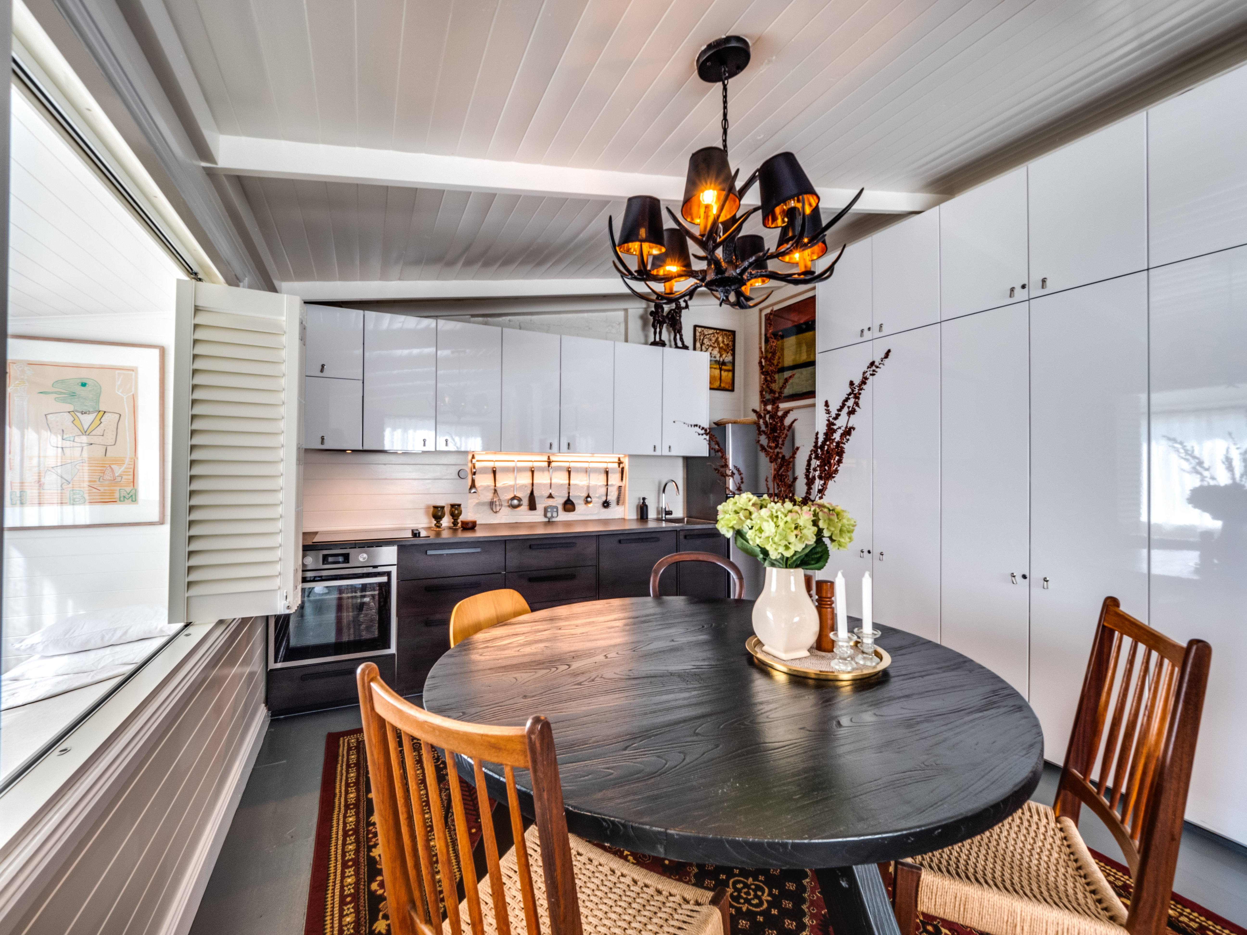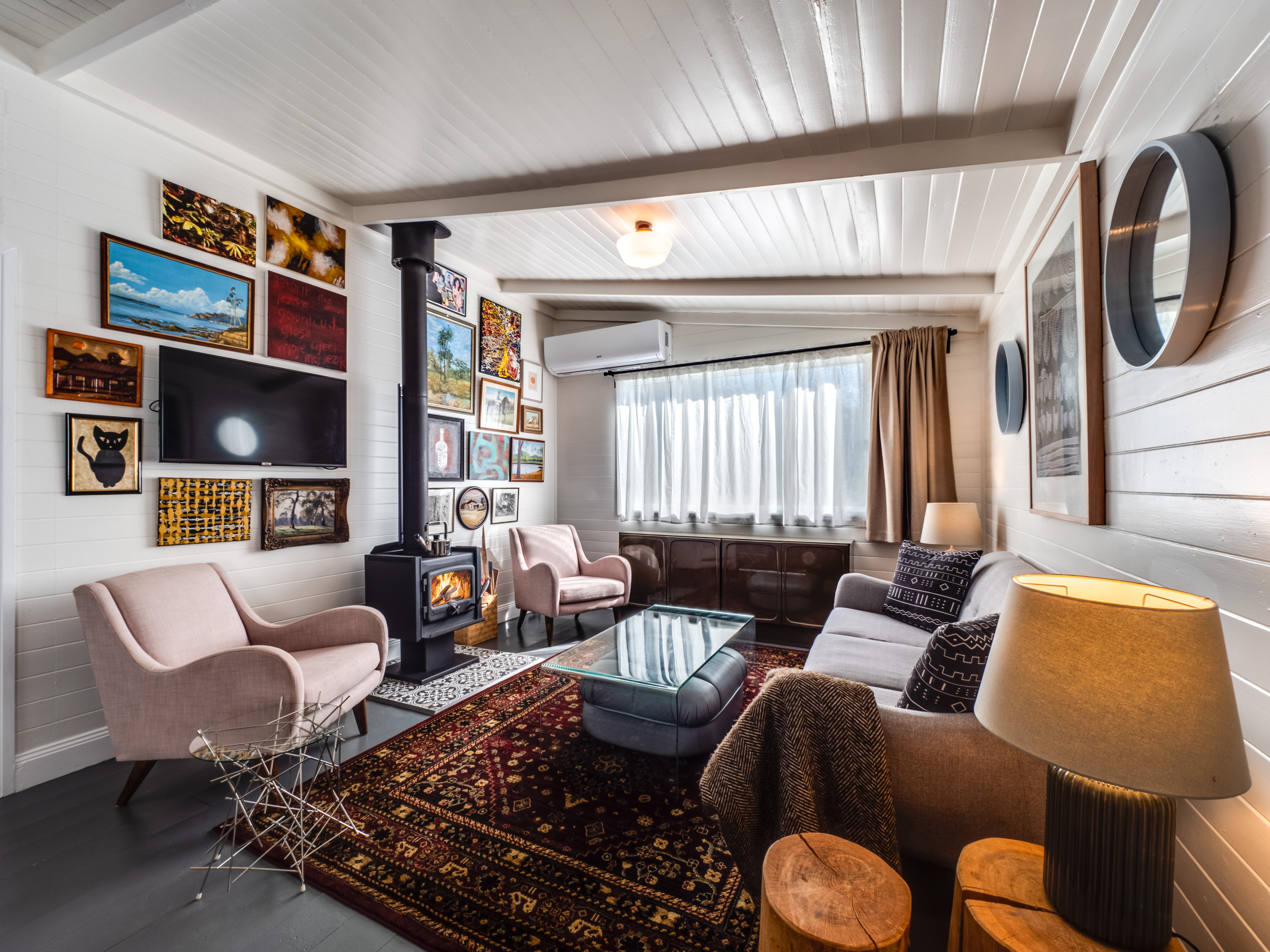 - Open‑plan living with shiplap walls, exposed beams & high ceilings