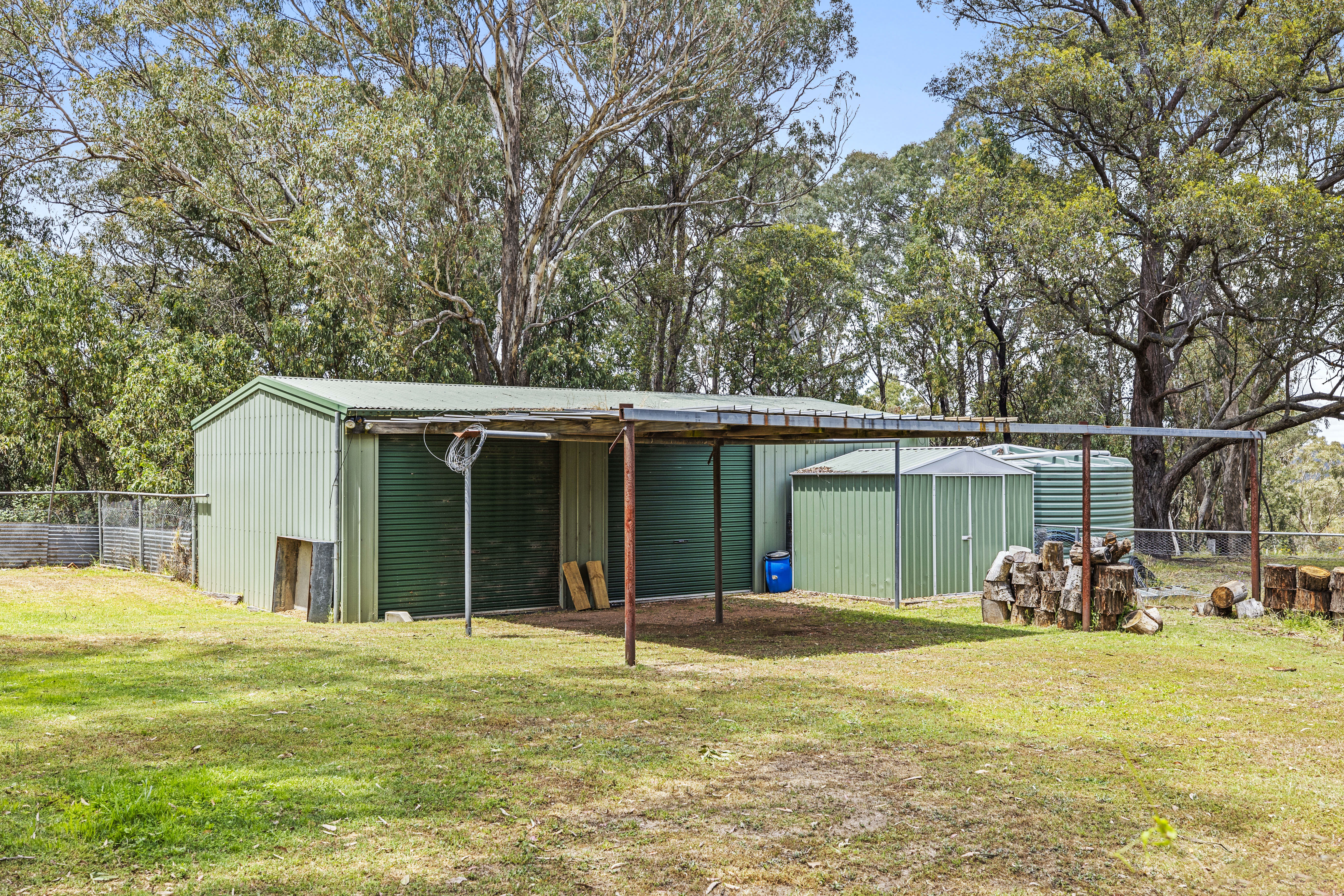 Outside, the property impresses with practical amenities: a barn-style shed with an upstairs balcony ideal for a studio or workshop, a large powered work shed with concrete floors, multiple water tanks, and fully fenced yard and paddock—perfect for hobby farming or pets.