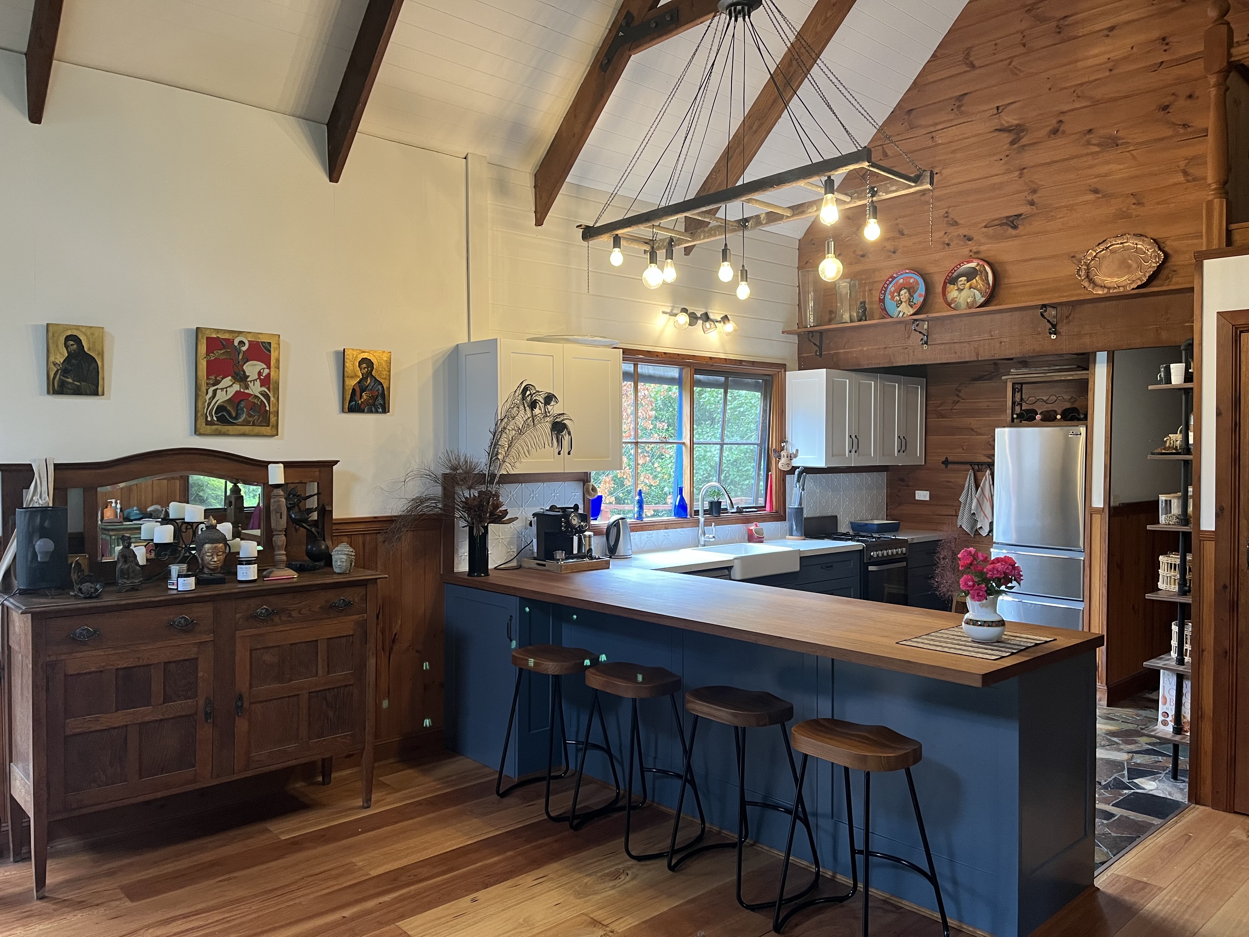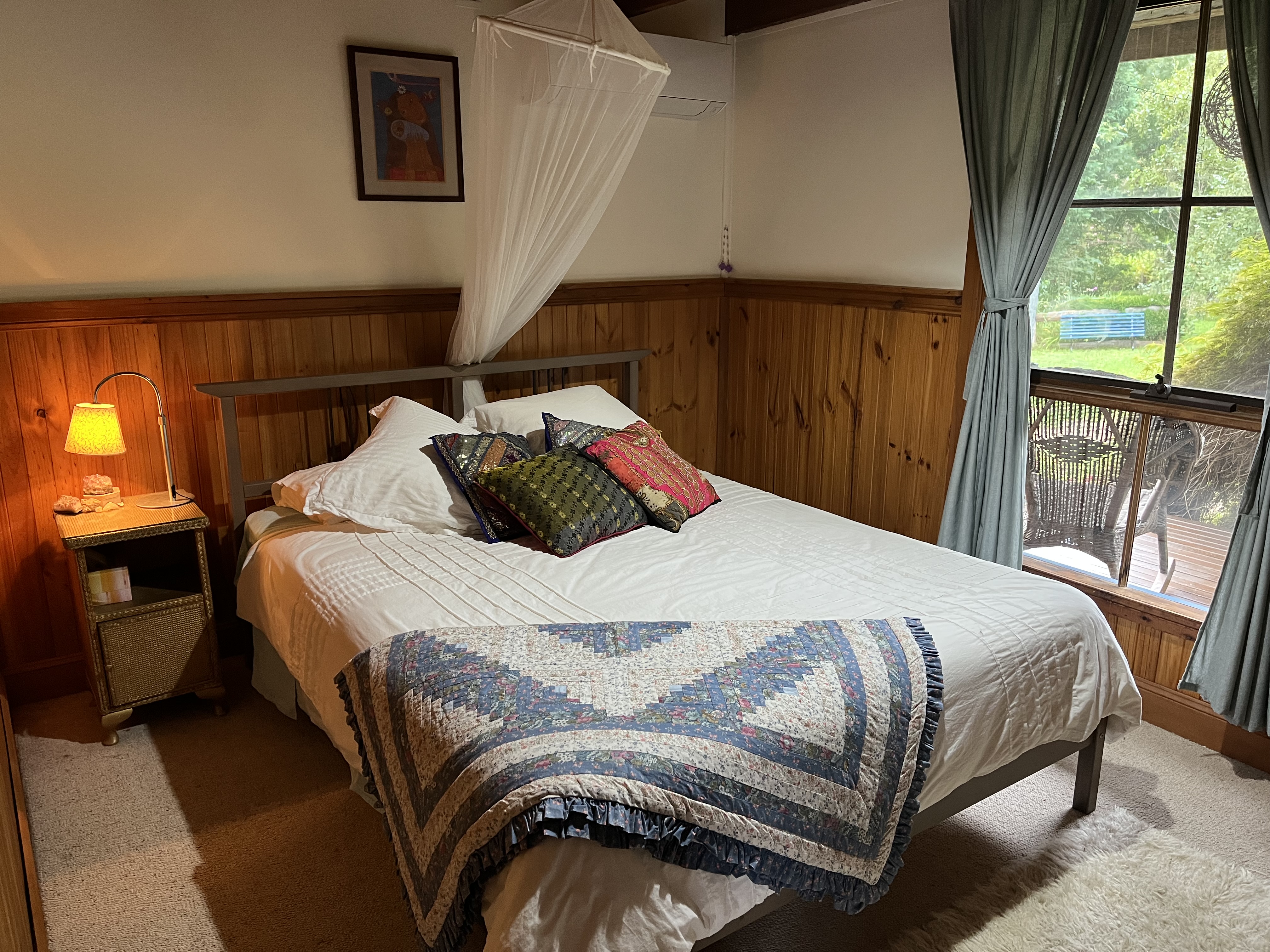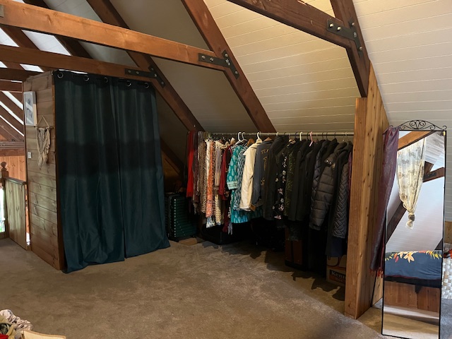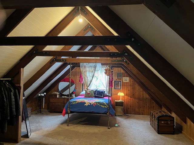 Inside, the character-filled residence blends space and warmth with soaring cathedral ceilings and an inviting open-plan living area. The kitchen is well-appointed, and the original bathroom adds charm, while the ground floor boasts two generously sized bedrooms. Upstairs, the loft-style master suite provides a stunning retreat, perfect as a main bedroom, private sanctuary, or home office with breathtaking views of the garden surrounds.