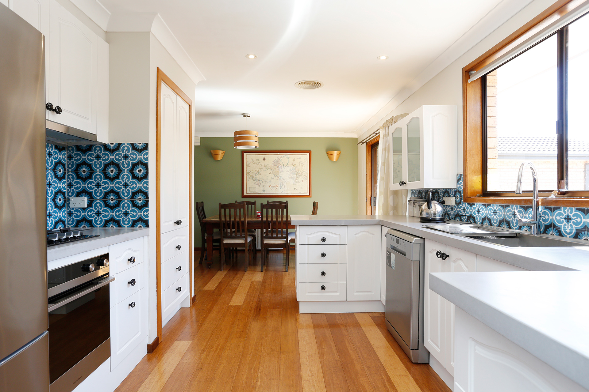 Open plan modern kitchen and dining with dishwasher and new appliances
