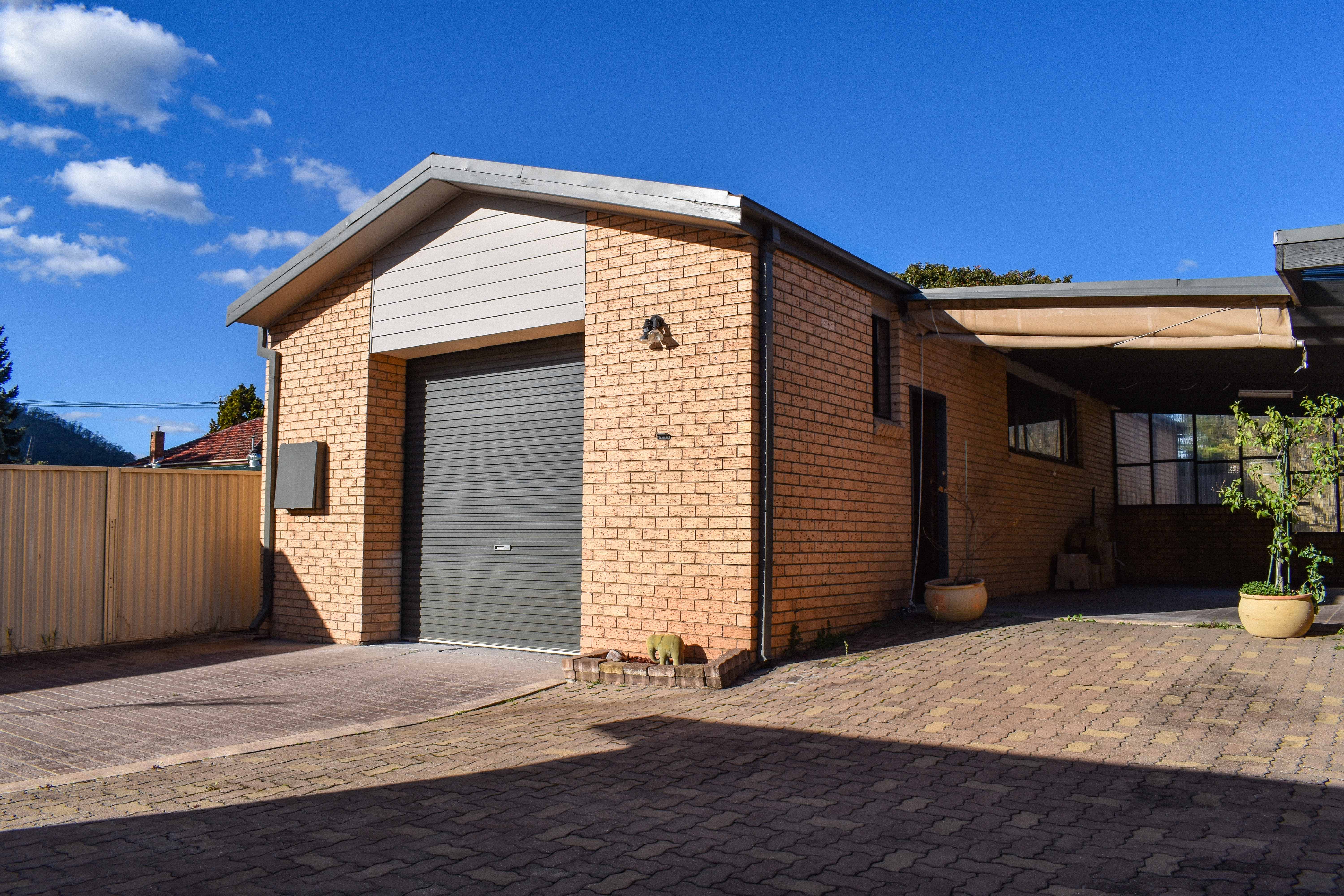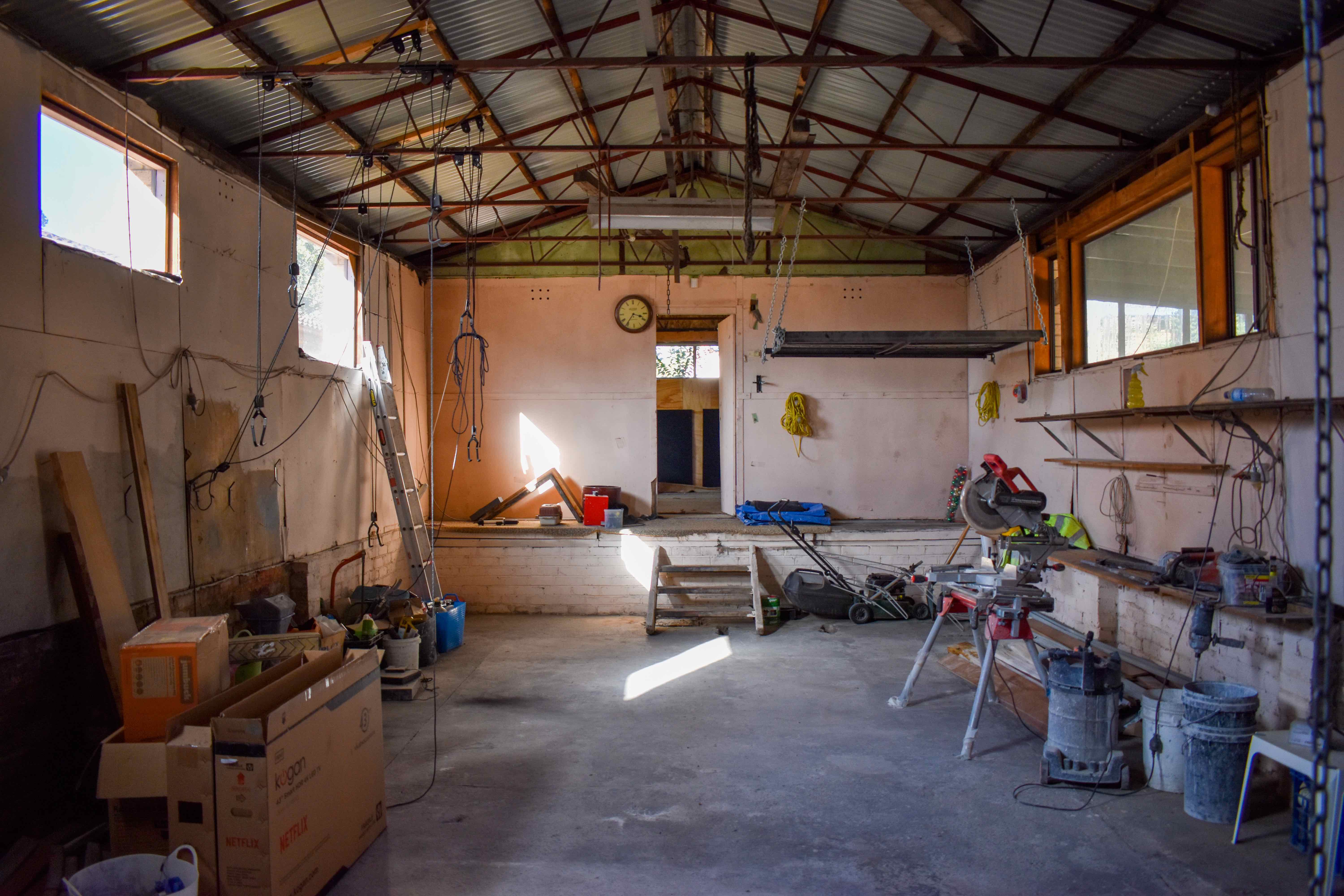 Large brick garage/workshop with storage area