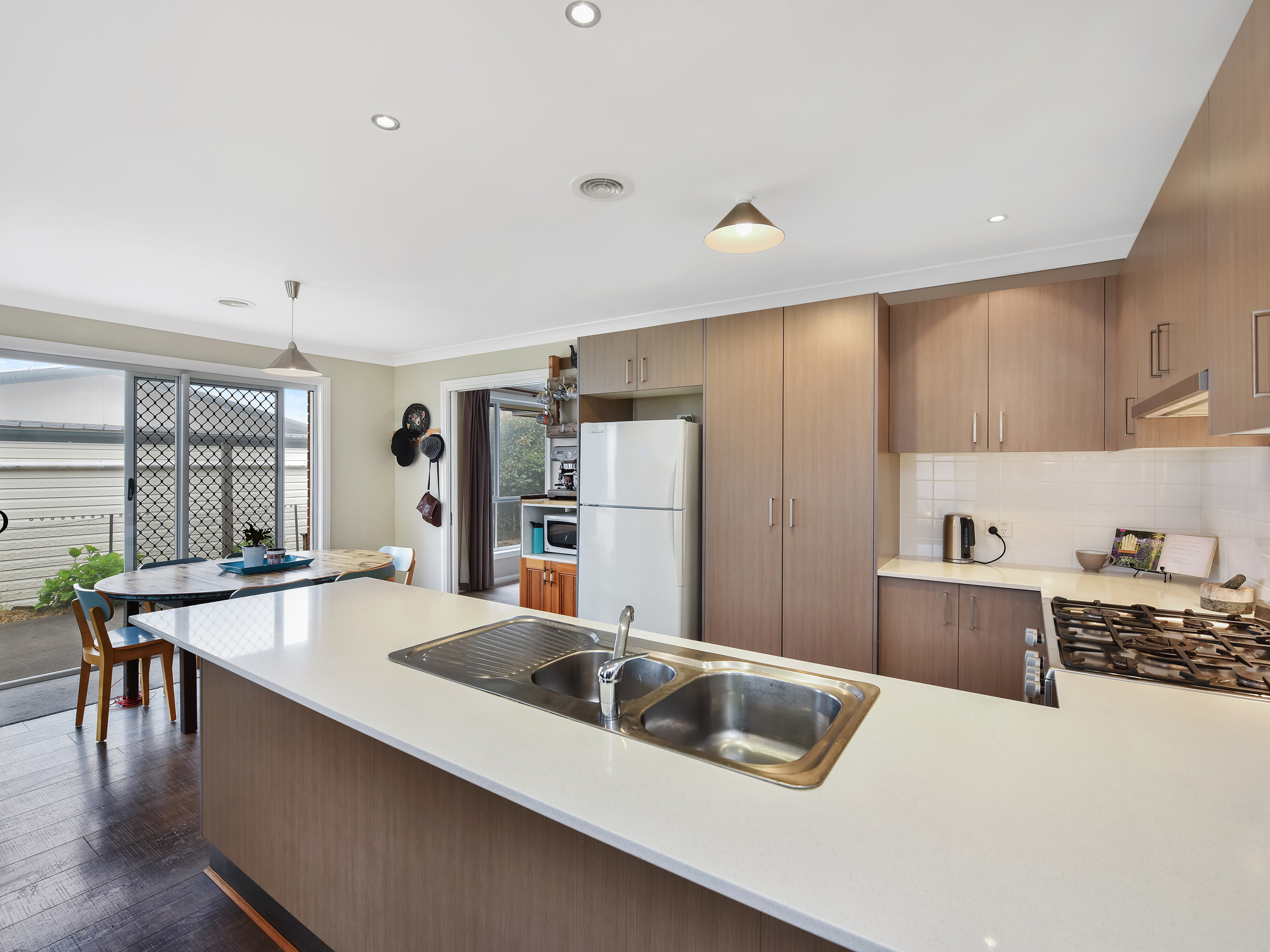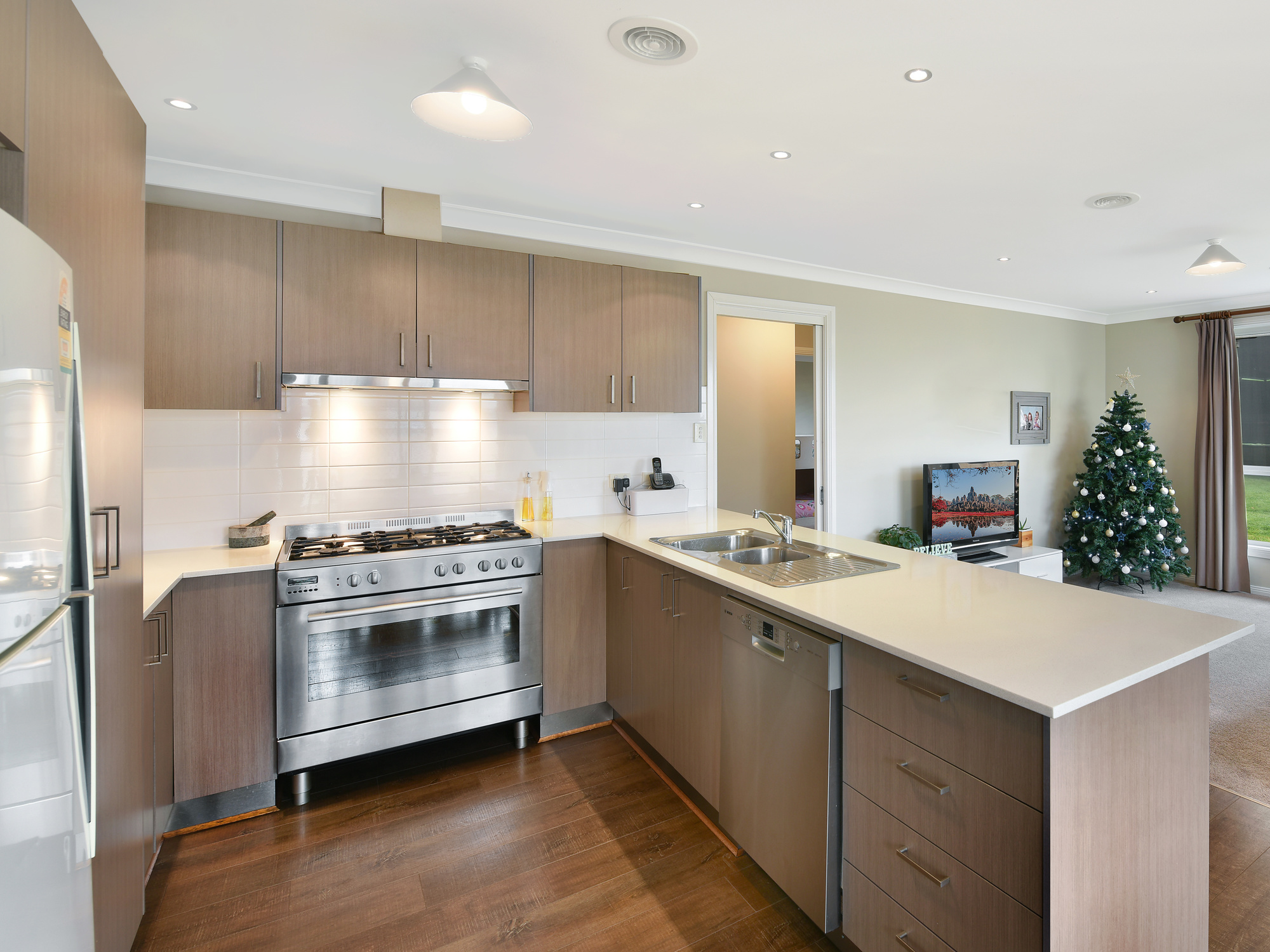 The modern brick veneer home includes a Ceasar stone kitchen with a dual fuel oven and compliments natural components like timber-look, easy clean floating floors.