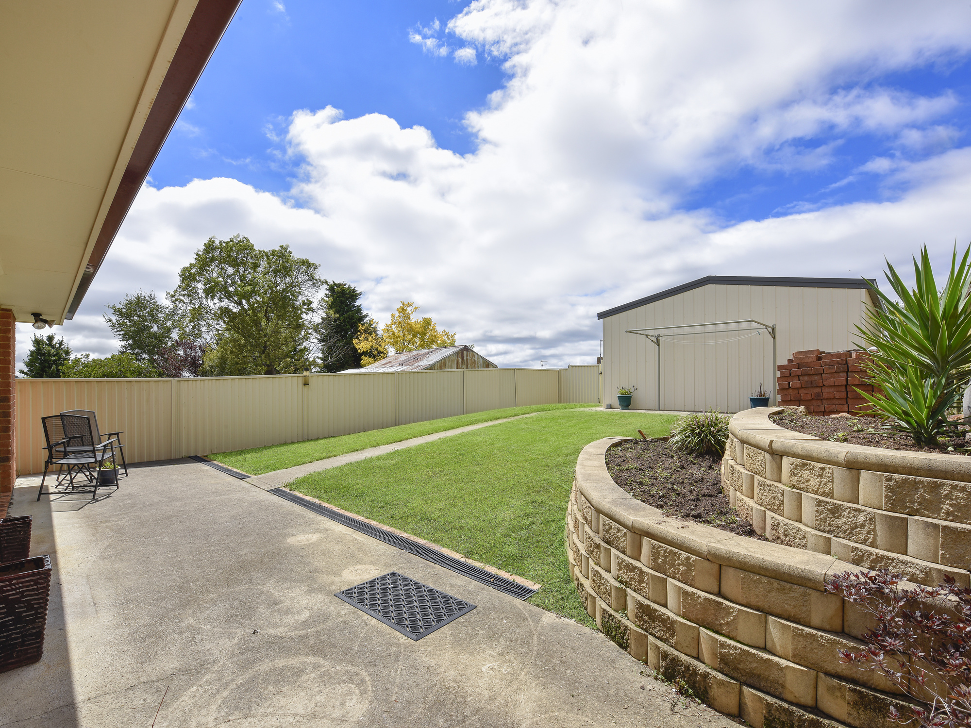 The house includes an open plan family kitchen and dining, plentiful lounge space, large laundry with sunny window, three bedrooms with built-ins, an enormous bathroom, shed, secure outdoor zones, and a separate shed.